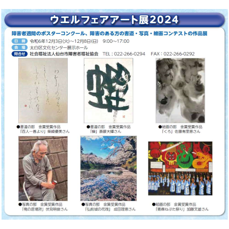 | その他 | ・事前申し込み不要、直接会場へお越しください。 ・イベントチラシ:shougaishashukan2024 ・障害者週間関連イベントの詳細については、仙台市ホームページをご覧ください。 ・お問い合わせ先:社会福祉法人 仙台市障害者福祉協会(022-266-0294) |