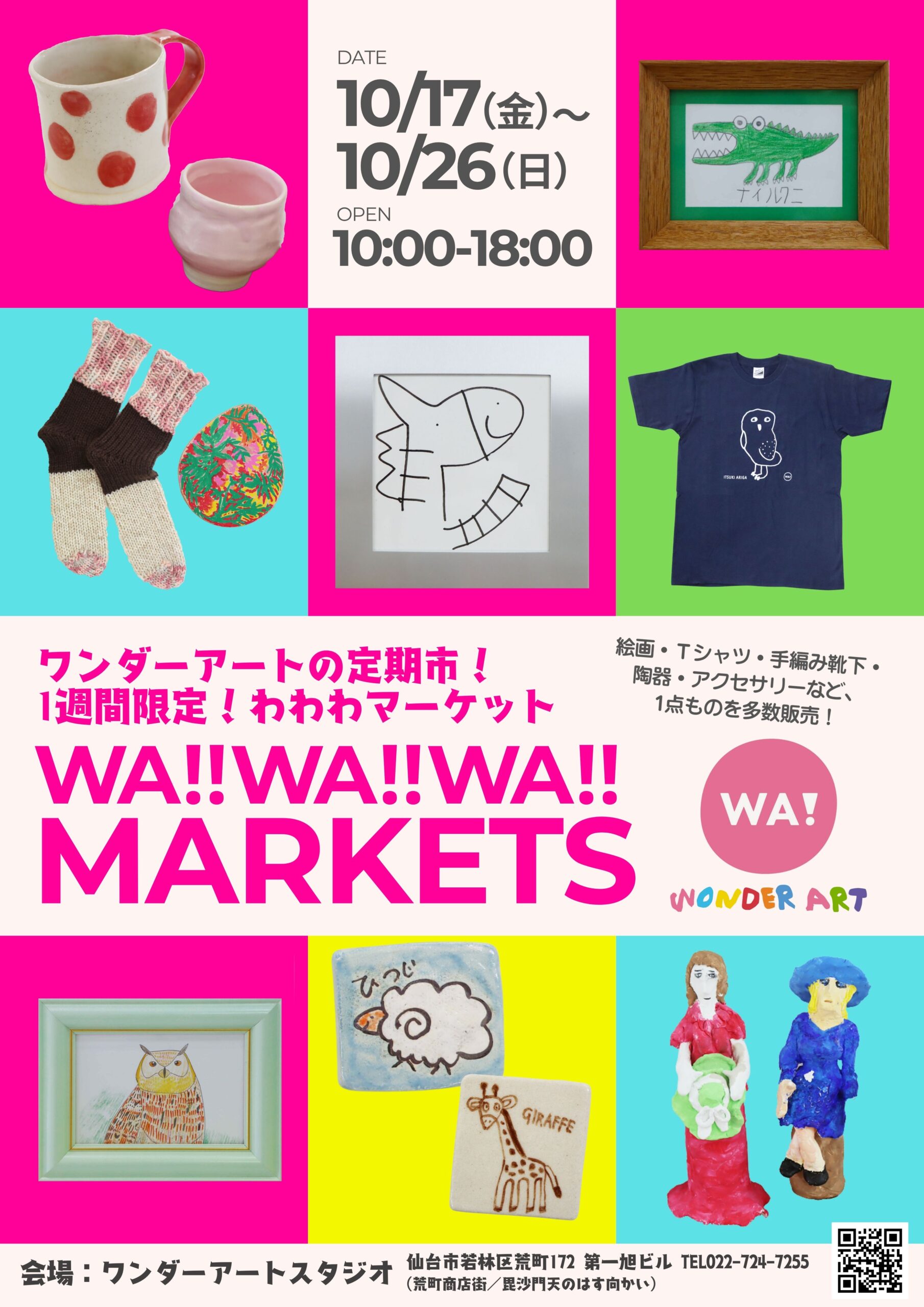 ボーダレスアトリエ<Wonder Art Studio>と就労継続支援B型<Wonder Workers>を運営するワンダーアートが開催するマーケット。今年度から定期開催がはじまり、今回で2回目。作品が生まれるスタジオを見学しながら、アートな日用雑貨の買い物が楽しめます。ポストカード、陶器のアクセサリー、手編みのルームシューズやアームカバー、Tシャツ、バック、お皿やコップなど一点ものも多数販売。ギャラリーで作品を鑑賞できるほか、購入も可能です。