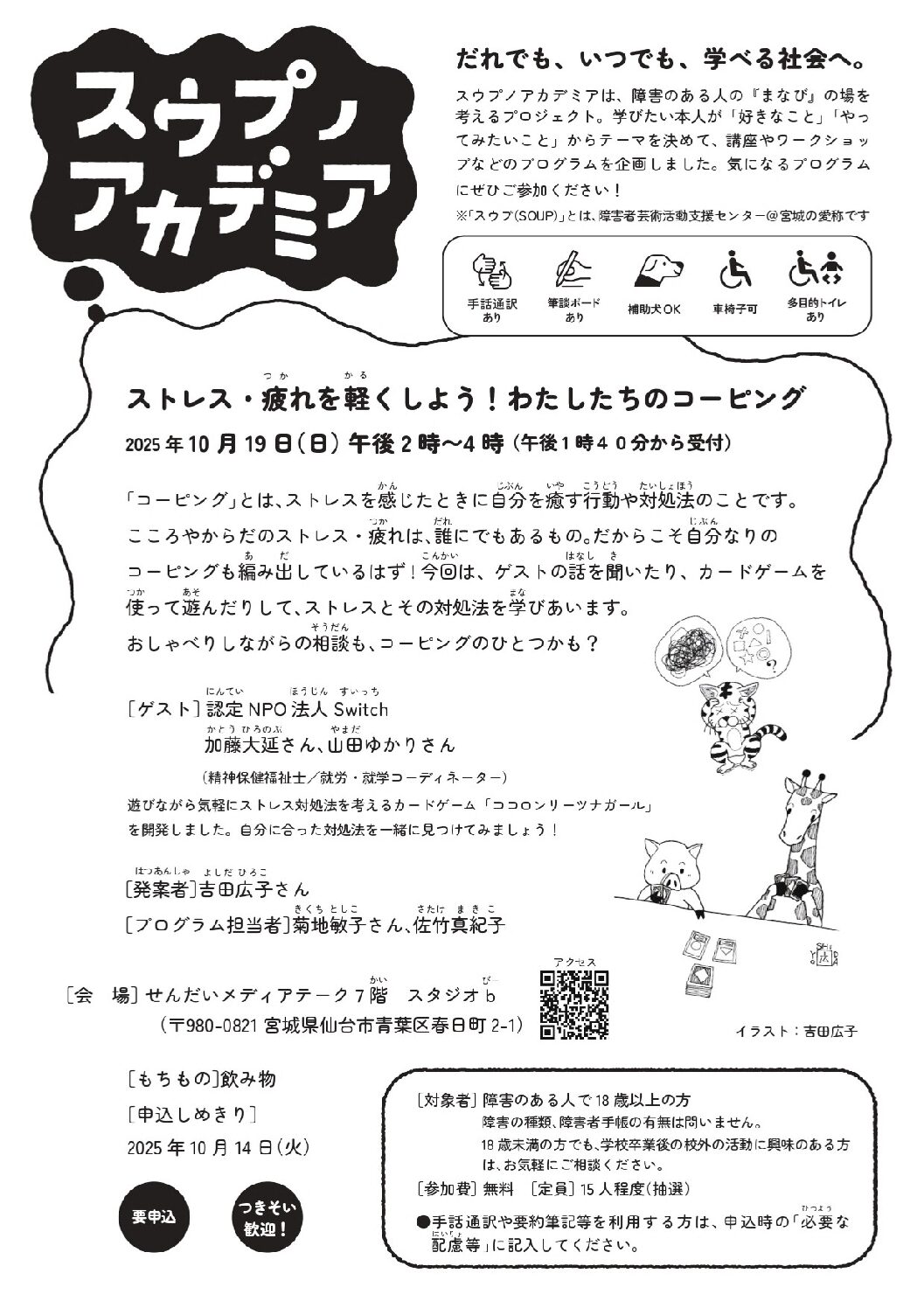 その他 | お問い合わせ先:NPO法人エイブル・アート・ジャパン東北事務局 ■対象 ■「スウプノアカデミア2025」ウェブサイト 文部科学省 令和7年度「学校卒業後における障害者の学びの支援推進事業」 |