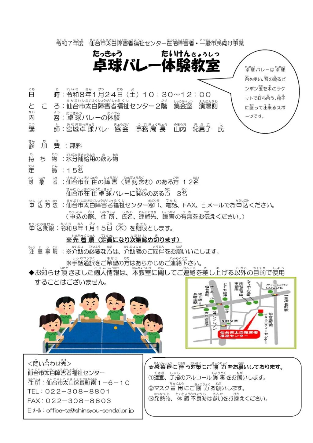 | その他 | お問い合わせ先:仙台市太白障害者福祉センター ①申込期間 令和8年1月15日(木)を申込期限とする。 |