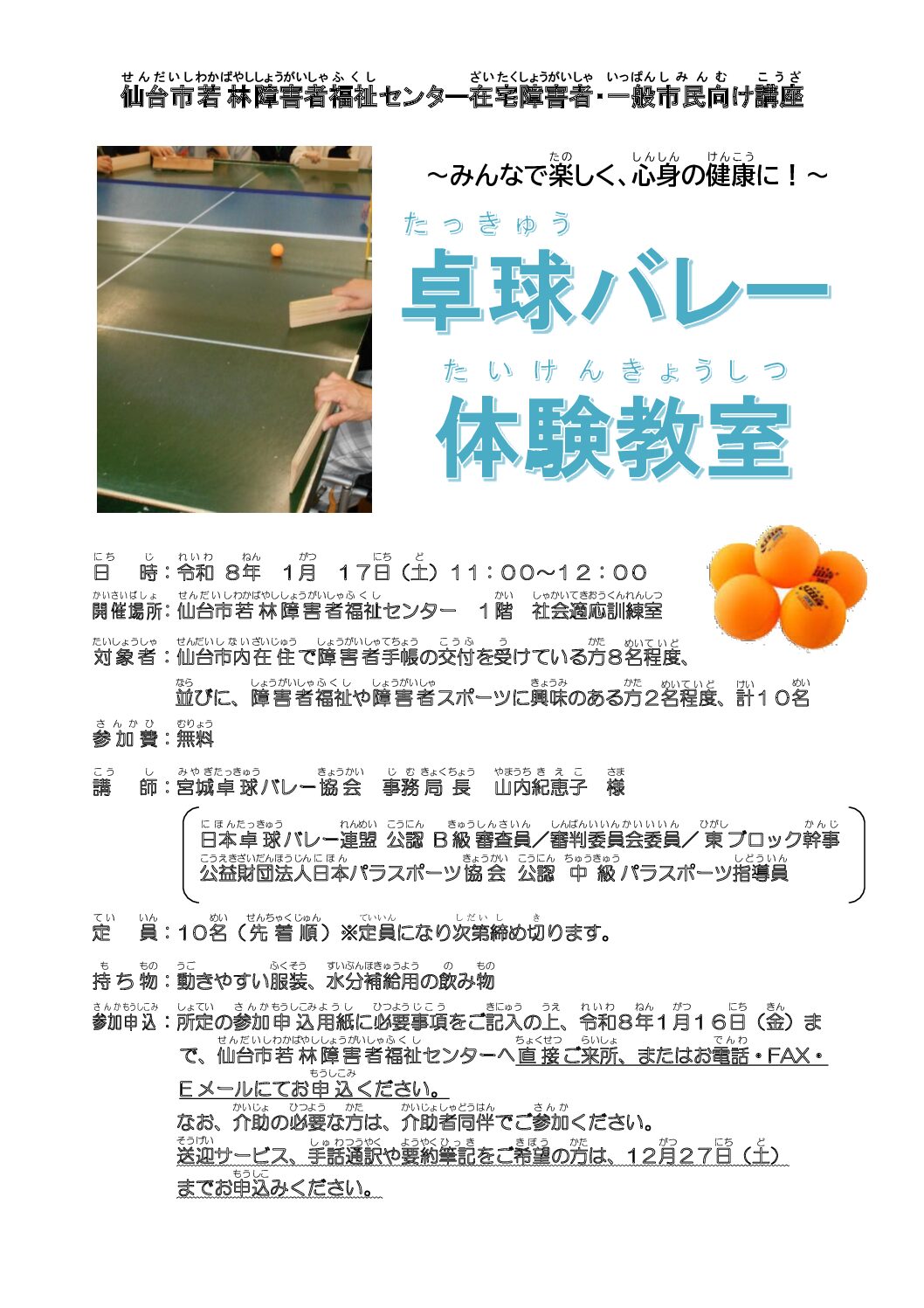 令和7年度仙台市若林障害者福祉センター 在宅障害者・一般市民向け講座卓球バレー体験教室~みんなで楽しく、心身の健康に!~